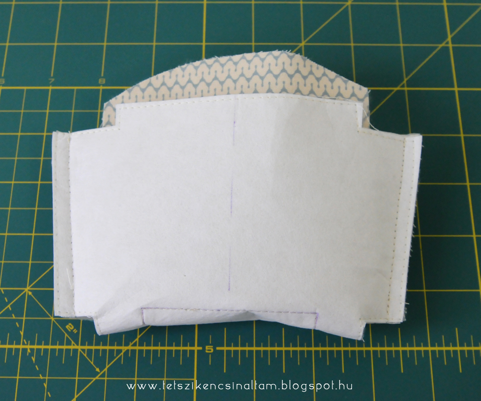 4. A csatos tárca rész külső felének (vlies-zel vasalt) fonákjához 2-3 mm-es varrásszélességgel hozzávarrjuk a bevarrható közbélést. Most varrjuk fel a pamut szalagot ha a külsejére szeretnénk tenni.